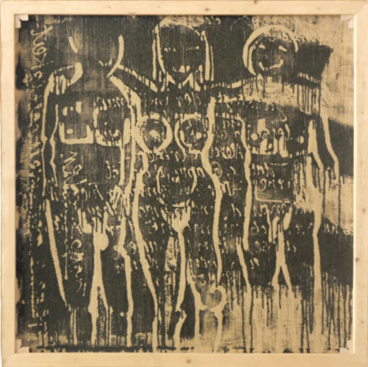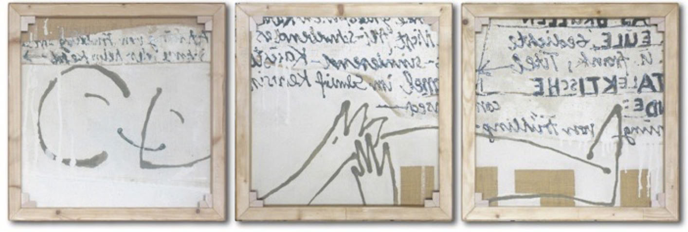 KOPF UND KRAGEN DES GEMEINEN KÜNSTLERS Acryl auf Jute, 75 x 230 x 5,5 cm / Triptychon
